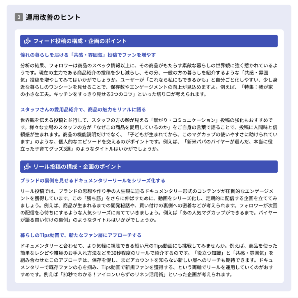 ⑤ 具体的な運用改善のヒント:分析結果に基づき「次はどのカテゴリを増やすべきか」をAIがアドバイス。